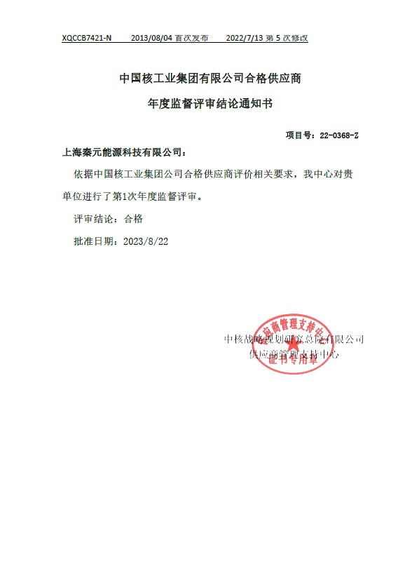 2023年6月上旬,我公司進(jìn)入中國(guó)核工業(yè)集團(tuán)有限公司合格供應(yīng)商年度監(jiān)督評(píng)審工作,經(jīng)過兩個(gè)多月的線上審核,秦元能源公司順利通過各項(xiàng)審核工作,結(jié)論通知書如下:
